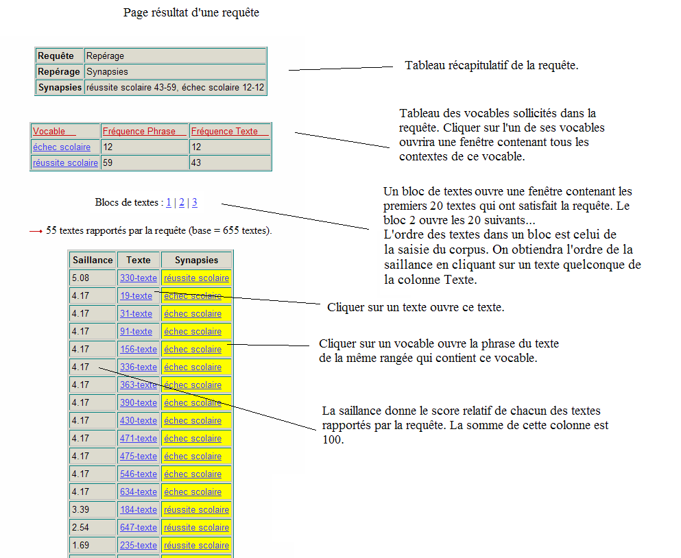liste de toutes les synapsies du corpus qui contiennent ce mot. Ce "mot" doit être lemmatisé, c'est-à-dire écrit à la forme masculine et singulière pour les noms et adjectifs (lorsque c'est possible) ou à la forme infinitive pour les verbes. Si on veut toutes les synapsies autour de "service" par exemple, on doit entrer la forme "service" et non la forme "services". Chaque synapsie est présentée avec deux nombres. Le premier indique la fréquence textuelle de la synapsie : le nombre de textes où elle a été trouvée. Le second indique la fréquence totale de la synapsie dans tout le corpus. Ainsi, si une synapsie a la mention 8-12, cela signifie qu'elle a été trouvée dans 8 textes différents pour un total de 12 occurrences, elle apparaît donc plus d'une fois dans certains textes. Exemple de requête en repérage de synapsies sur le projet abascoAbasco est un corpus de type questionnaire (Sémato Sondage) avec questions ouvertes. Pour en savoir plus sur abasco.Nous adressons la requête en repérage de synapsies suivante : ![]() Sémato ouvrira la fenêtre suivante qui contient toutes les synapsies construites avec le mot scolaire (extrait de la page réelle): ![]() La prochaine page-écran montre la page de résultat de cette requête en repérage des deux synapsies sélectionnées : réussite scolaire et échec scolaire. Tous les liens de cette page ouvrent des pages d'arrimage. ![]() |