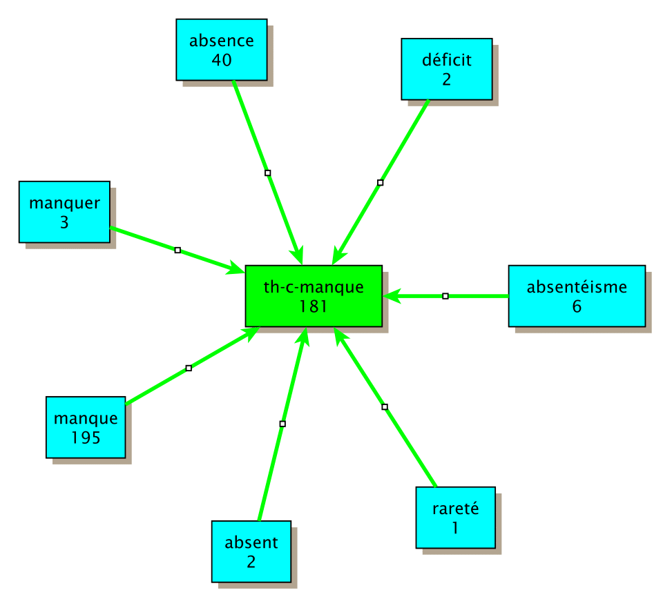 Les synapsies représentent des unités contextuelles fortes. Voici des exemples de synapsies avec le lemme manque : manque de suivi, manque de soutien, manque de valorisation, manque de supervision... Suivez ce lien pour examiner les 68 synapsies trouvées avec le lemme manque dans le projet abasco : Les chiffres dans les noeuds indiquent la fréquence du lemme, ceux sur les liens la fréquence de la relation entre deux lemmes. Par exemple, manque apparaît 18 fois dans le contexte synaptique de soutien (comme dans manque de soutien). Le dernier niveau est celui des thèmes. Il n'est pas obligatoire d'avoir déjà des thèmes pour créer les représentations graphiques. Les thèmes sont obtenus de façon automatique par la fonction GTH (trouvée sur la page des Thèmes de Sémato), ou par vos efforts de construction assistée (avec l'AST ou Assistant Scripteur de Thèmes), ou encore de manière manuelle par des arrimages directs aux phrases ou textes du corpus. Dans cet exemple, nous utilisons les thèmes de la GTH-C. Les noms de ces thèmes commencent par les lettres th-c-. Voici le thème th-c-manque qui est composé de 7 ingrédients et qui se trouve dans 181 phrases des textes réponses aux questions ouvertes d'abasco :