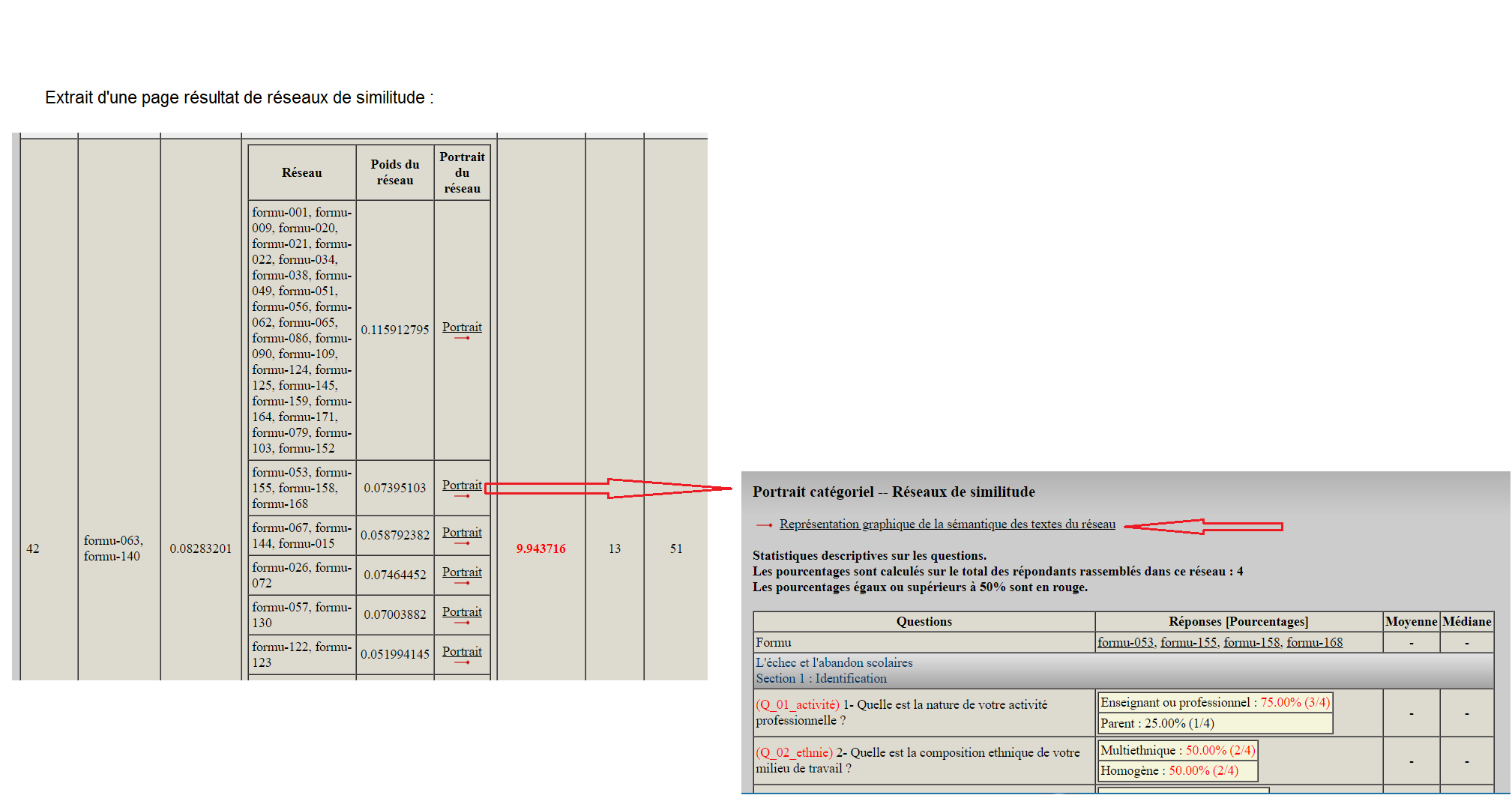 Tableur des synapsies (Excel) complet Les synapsies sont présentées par ordre de fréquence descendante. Le tableur indique à la dernière colonne si la synapsie est dominante (1) ou pas (0) dans la section de corpus. Graphes sur section de corpus : le calcul de dominancePar la seconde question de la requête, l'analyse propose de limiter le graphe à une section de corpus. Dans notre exemple, nous avons restreint le corpus aux répondants hommes.Lorsqu'un graphe est commandé sur une section de corpus, il peut être intéressant de savoir si une synapsie ou un noeud (lemme ou thème) est relativement plus fréquent dans la section de corpus programmée que dans le reste du corpus. Sémato compare la fréquence que l'élément (noeud ou synapsie) possède dans la section, à celle qu'il possède dans le reste du corpus. Cette comparaison est pondérée par le poids relatif de la section par rapport au reste du corpus. Examinons le tableau :